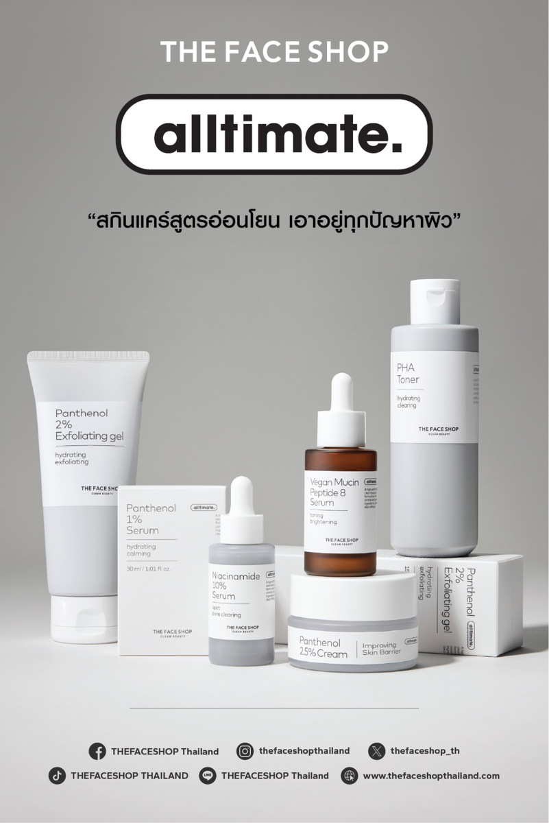 ผลิตภัณฑ์ THE FACE SHOP “Alltimate” เป็นผลิตภัณฑ์บำรุงผิวที่สะท้อนให้เห็นถึงความมุ่งมั่นที่จะนำเสนอผลิตภัณฑ์ที่มีคุณภาพและตอบโจทย์ความต้องการของลูกค้าอย่างครบวงจร ที่ THE FACE SHOP ตั้งใจพัฒนาขึ้นภายใต้แนวคิด Clean Beauty หรือผลิตภัณฑ์ที่อ่อนโยนต่อผิว ไม่ก่อให้เกิดการระคายเคือง และมีประสิทธิภาพสูง ตอบสนองได้ทุกความต้องการ เป็นผลิตภัณฑ์ที่คัดสรรส่วนผสมที่มีประสิทธิภาพในการปกป้องดูแลผิวและมีราคาที่สมเหตุสมผล เพื่อตอบสนองความต้องการที่หลากหลายของทุกสภาพผิว