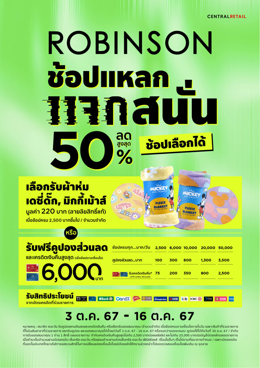 กลับมาอีกครั้งตามคำเรียกร้อง! ห้างสรรพสินค้าโรบินสัน ในเครือเซ็นทรัล รีเทล ตอกย้ำเดสติเนชันแห่งการช้อปคุ้มแก่ครอบครัวทั่วไทย เสิร์ฟความคุ้มแบบต่อเนื่องกับแคมเปญ “ROBINSON ช้อปแหลก แจกสนั่น ครั้งที่ 2” จัดหนักโปรโมชันแรงทั้งส่วนลดและของสมนาคุณมากมาย ให้นักช้อปเลือกช้อปได้ในแบบที่ชอบ ตั้งแต่วันที่ 3 ต.ค. – 16 ต.ค. 67 ที่ห้างโรบินสันทุกสาขา (ยกเว้นสาขาจังซีลอน) รวมทั้งหลากหลายช่องทางการช้อปปิ้งสุดสะดวกของห้างฯ ไม่ว่าจะเป็น……
