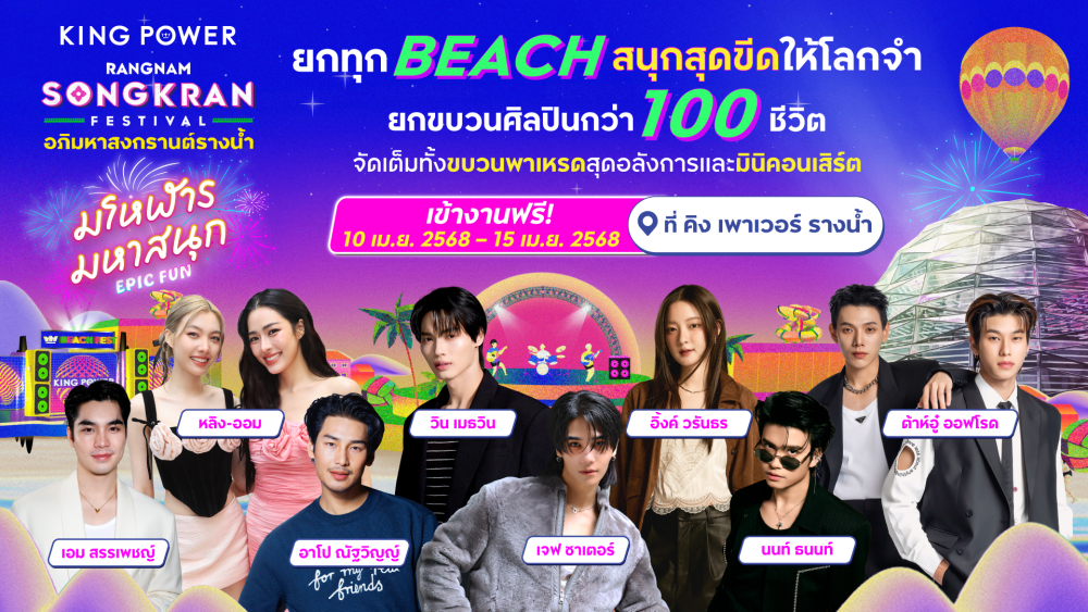 (2 เมษายน 2568) คิง เพาเวอร์ เล่นใหญ่จัดเต็มต้อนรับเทศกาลสงกรานต์ ยกทัพศิลปินคนดัง สาดความสนุก ในงาน “อภิมหาสงกรานต์รางน้ำ มโหฬาร มหาสนุก” ยกทุก BEACH! สนุกสุดขีดให้โลกจำ จำลองชายหาดชื่อดังของไทยมารวมไว้