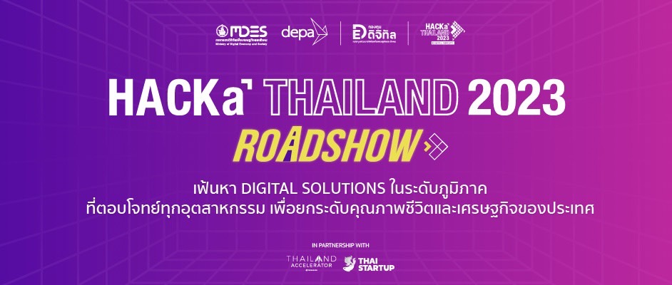 สำนักงานส่งเสริมเศรษฐกิจดิจิทัล (depa) ร่วมกับ โครงการ Thailand Accelerator by Techsauce และสมาคมการค้าสตาร์ทอัพไทย (Thai Startup) เดินหน้ากิจกรรม HACKaTHAILAND 2023 Roadshow ลงพื้นที่ทั่วประเทศ เพื่อเฟ้นหา DIGITAL SOLUTIONS ที่ตอบโจทย์ทุกอุตสาหกรรม และเตรียมพร้อมสู่การเป็นสุดยอดดิจิทัลโซลูชันไทย พิชิตเงินรางวัลรวมกว่า 1 ล้านบาทจากเวทีการแข่งขัน HACKaTHAILAND 2023: DIGITAL INFINITY HACKATHON กิจกรรมสำคัญเตรียมพร้อมพลังคนรุ่นใหม่ที่มากับความสามารถทางเทคโนโลยี เพื่อเป็นกำลังสำคัญในการขับเคลื่อนเศรษฐกิจ