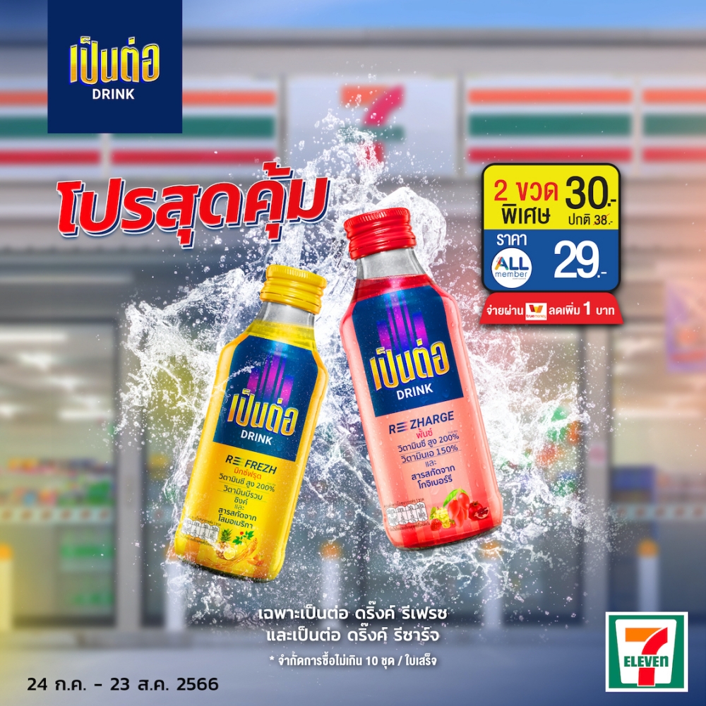 เป็นต่อ ดริ๊งค์ มีจำหน่ายแล้ววันนี้ ที่ 7-Eleven ทุกสาขาทั่วประเทศ และมีโปรโมชั่นสุดคุ้ม ซื้อ 2 ขวด รสชาติ เป็นต่อ ดริ๊งค์ รี-เฟรซ (สีเหลือง) และ เป็นต่อ ดริ๊งค์ รี-ซาร์จ (สีแดง) 2 ขวด ในราคา 30 บาท จากปกติ 38 บาท ตั้งแต่วันที่ 24 ก.ค. – 23 ส.ค. 2566 พร้อมติดตามกิจกรรมเดินสายแจกผลิตภัณฑ์ย่านสำนักงานทั่วกรุงเทพฯ ได้ที่ Facebook: เป็นต่อ DRINK, Instragram: pentordrink และ Tiktok: เป็นต่อ DRINK