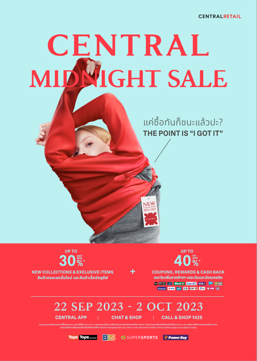 ห้างสรรพสินค้าเซ็นทรัล ในเครือเซ็นทรัล รีเทล ตอกย้ำความสำเร็จของแคมเปญซิกเนเจอร์ที่นักช้อปหลงรัก กับแคมเปญ “Central Midnight Sale” มหกรรมเซลระดับตำนานที่ครองใจนักช้อปทุกไลฟ์สไตล์ กลับมาสร้างสีสันความสนุกพร้อมคอนเซ็ปต์ใหม่ “แค่ช้อปทันก็ชนะแล้วป่ะ” ผนึกกำลังแบรนด์ดังทั้งห้าง หยิบไอเทมป๊อบ สินค้าฮอตฮิต จากทุกหมวดหมู่ ทั้งบิวตี้ แฟชั่น สินค้าโฮม และอีกมากมาย นำมาจัดดีลสุดเอ็กซ์คลูซีฟ พร้อมมอบส่วนลดสูงสุด 70% และยังจับมือกับพาร์ทเนอร์บัตรเครดิตชั้นนำมอบข้อเสนอสุดพิเศษแห่งปีเฉพาะแคมเปญนี้ ระหว่างวันที่ 22 ก.ย. 66 – 2 ต.ค. 66 ที่ห้างเซ็นทรัลทุกสาขา หรือผ่านช่องทางออมนิแชแนลสุดสะดวก