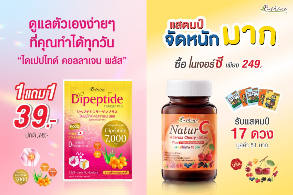 และอีกหนึ่งผลิตภัณฑ์ที่จัดโปรโมชั่นสุดคุ้ม คือ “บีไชน์ ไดเปปไทด์ คอลลาเจน พลัส” ขั้นสุดของคอลลาเจนที่ดี ดูแลได้มากกว่าผิว ผสาน 5 คุณประโยชน์เน้นๆ ได้แก่ ไดเปปไทด์คอลลาเจนจากปลา 7000 มิลลิกรัม นวัตกรรมใหม่จากประเทศญี่ปุ่นที่มีขนาดโมเลกุลเล็กที่สุด ดูดซึมได้ดีที่สุด โดยคอลลาเจนไดเปปไทด์สกัด เฉพาะ 2 คู่ ที่เรียกว่า PO และ OG ทำให้มีประสิทธิภาพสูงเมื่อเทียบกับไดเปปไทด์ทั่วไป ผสาน สารสกัดจากซีบัคธอร์น, สารสกัดจากว่านหางจระเข้, วิตามินซี และวิตามินอี ช่วยบำรุงผิวให้สวยเนียนใส ตึงกระชับ ลดริ้วรอย พร้อมเสริมข้อเข่าให้แข็งแรง สุขภาพดี รับประทานวันละ 1 ซอง สามารถผสมกับเครื่องดื่มและอาหารได้หลากหลายตามที่ต้องการ เช่น น้ำเปล่า ชา กาแฟ นม น้ำผลไม้ หรือเติมปรุงในอาหารต่างๆ เช่น ซุป โยเกิร์ต น้ำสลัด โดยไม่ทำให้รสชาติของอาหารเปลี่ยนแปลง