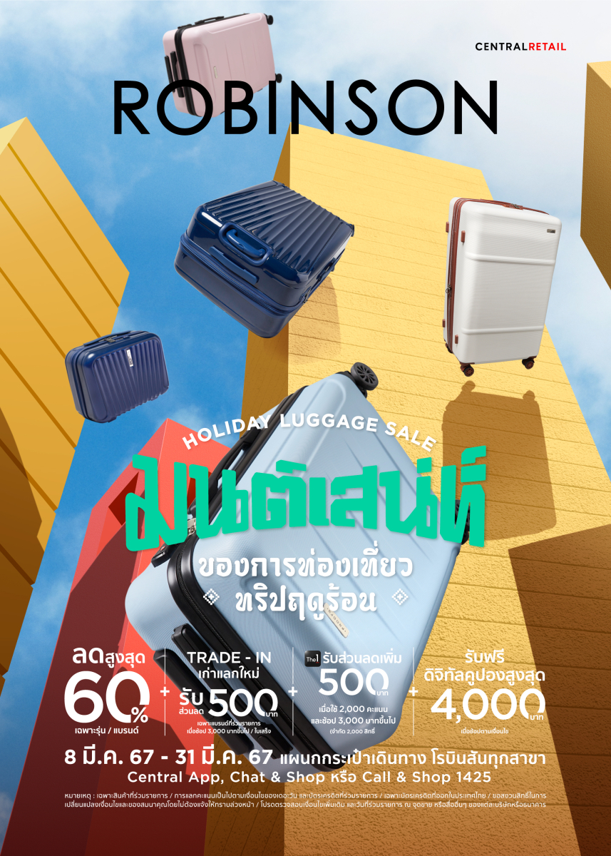 พิเศษ! สำหรับสายชอบเที่ยว ชวนมาช้อปไอเทมเพื่อไปสัมผัสมนต์เสน่ห์ของการท่องเที่ยวทริปฤดูร้อนในแคมเปญ “ROBINSON HOLIDAY LUGGAGE SALE” ตั้งแต่วันนี้ – 31 มี.ค. 67 ที่แผนกกระเป๋าเดินทาง ห้างโรบินสันทุกสาขา
