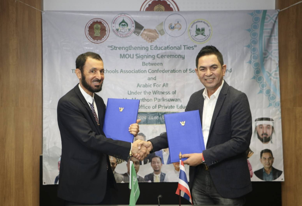 A groundbreaking memorandum of understanding (MoU) was signed today between The Private Schools Confederation Association of Southern Thailand, represented by Dr. Koddaree Binsen, its president, and the Arabic for All non profit company from Saudi Arabia, represented by Engineer Saleh Bin Nasser Al-Dalaan, Managing Director of Arabic for All. This historic collaboration marks the first time Thailand has received international support for developing education in schools under the Office of the Private Education Commission.